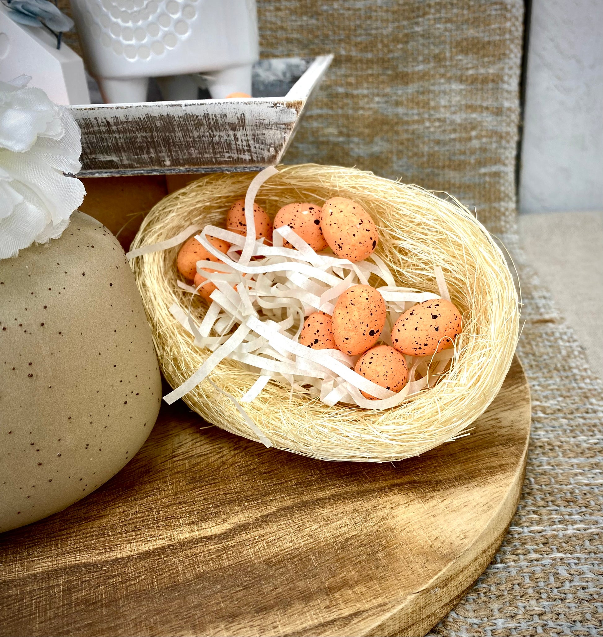 Unser kleines Sisalnest ist aus naturale Materialen, Sisal sind Pflanzenfasern. Das Nest ist perfekt für kleine Osterdekorationen oder du kann es auch zum dekorieren am Vasenboden. Lass deiner Kreativität freien lauf und Bastle oder dekoriere mit dem creme farbigen Sisalnest los.