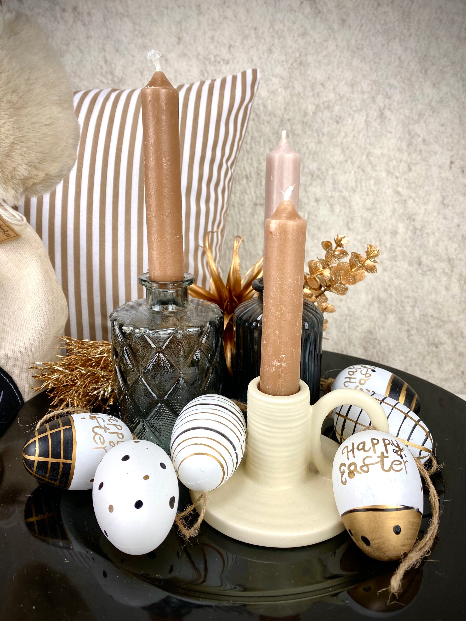 Unsere tollen Kunststoffeier haben alle eine Juteschnur zum Aufhängen und sind in Schwarz, Weiß und Gold gehalten. Sie haben Punkte, Streifen und mit Frohe Ostern Schriftzug. Perfekt um ein modernes, edles und stilvolles Osterfest zu dekorieren und feiern.