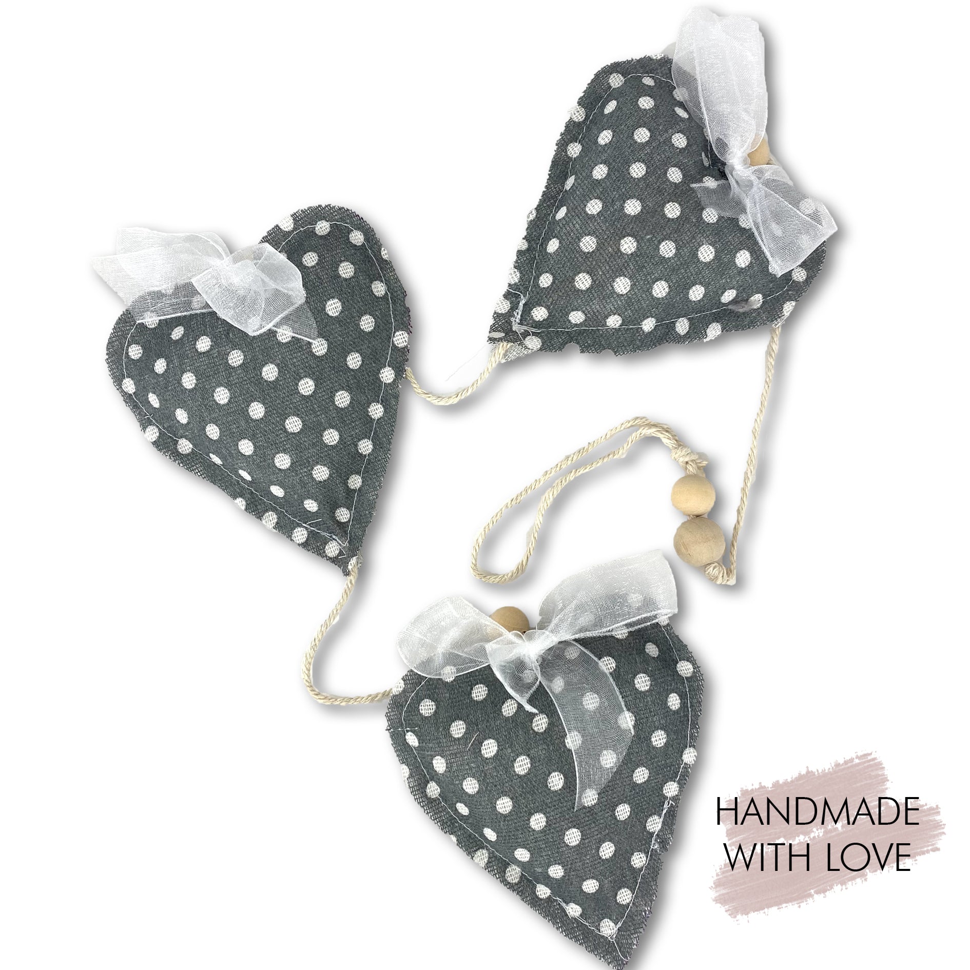 Unsere schöne Stoffgirlande hat herzförmige Kissen mit einer Schlaufe aus transparenten PES-Band und ein Pünktchenmuster aufgedruckt. Sie sind besonders schön für Tischdekorationen, an die Haustüre, in der Wohnung/an der Wand oder am Fenster. Die Herzen sind mit Viskose/PES Watte gefüllt und haben eine Holzperlen am oberen Ende.