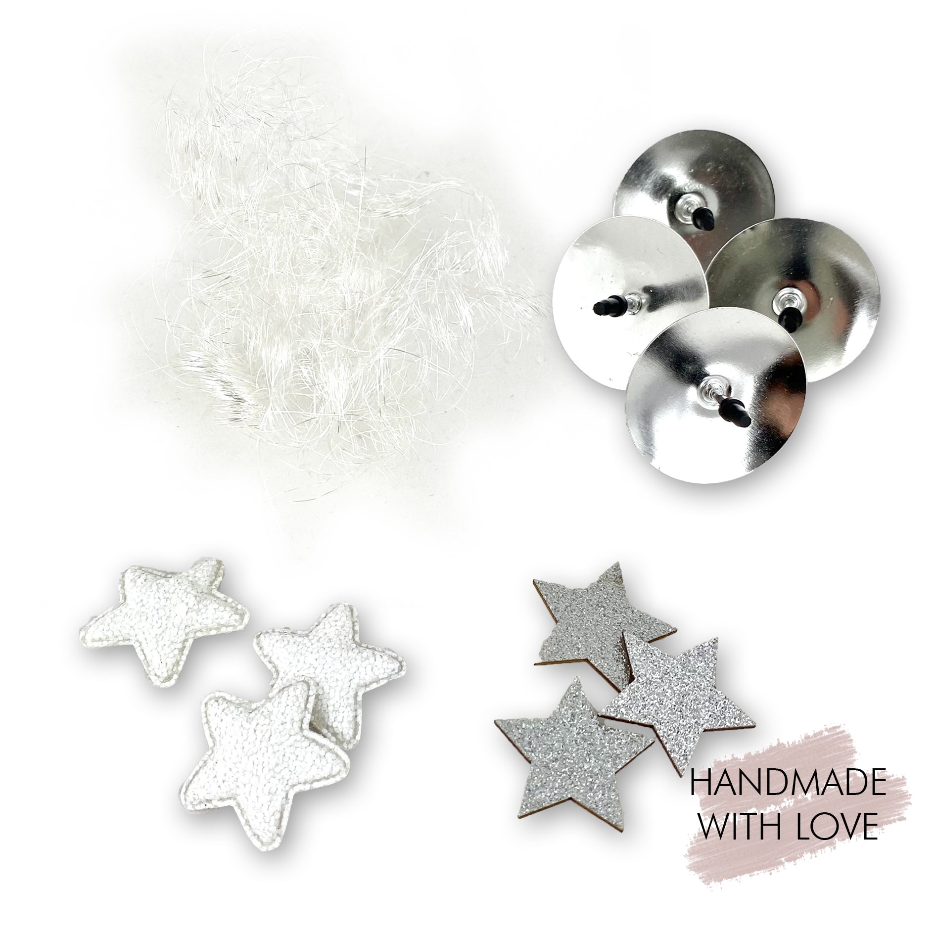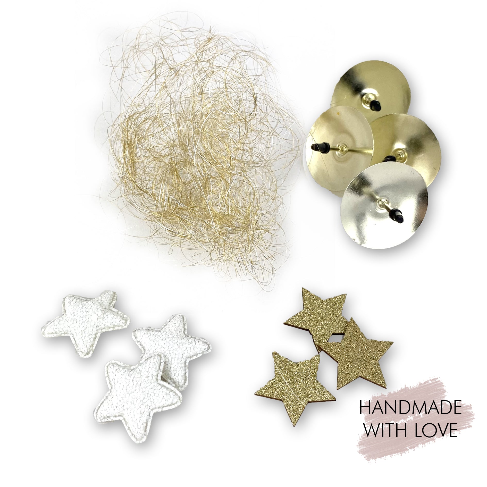 Inhalt: 1 Kranz, 4 Kerzenhalter, 6 Deko Sterne, etwas Engelshaar