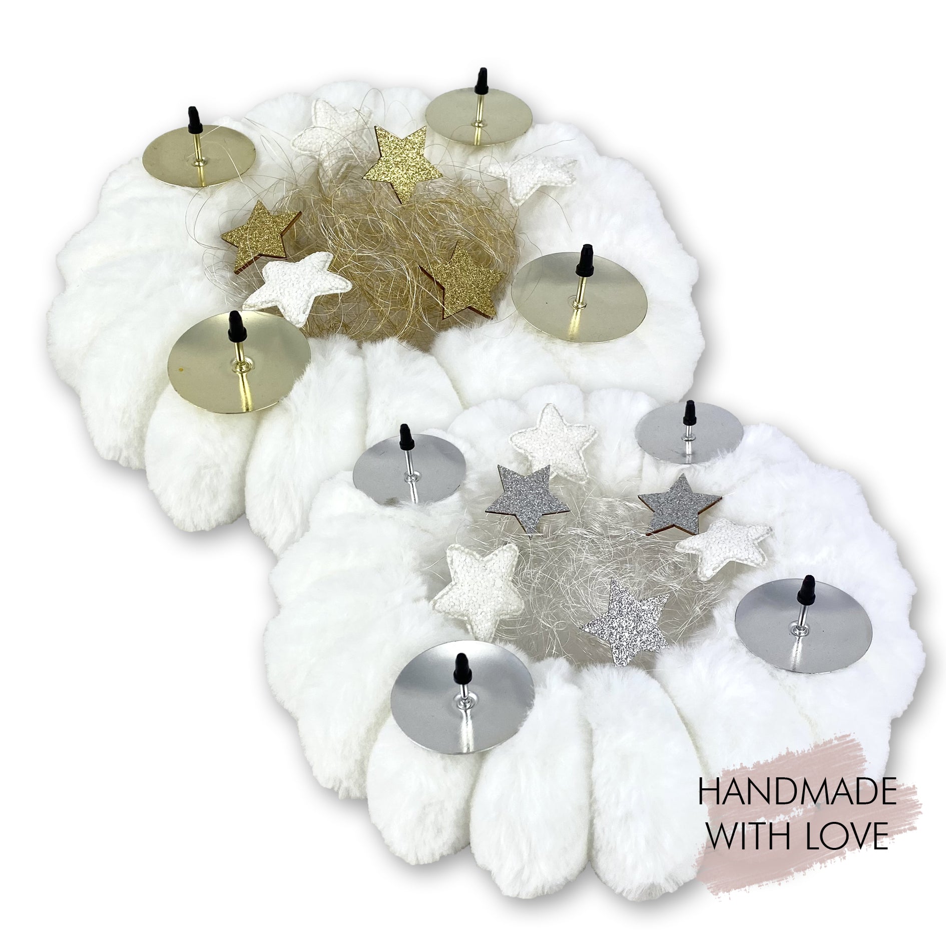 Gestallte mit diesem tollen Set deinen Adventskranz selbst! Im Set ist folgendes enthalten: ein Kunstfellkranz in Weiß, ein 4er Set Kerzenhalter, Glitzer Dekosterne aus Holz und Kunststoff und Engelshaar. Du kannst die Einzelteile auch anders verwenden, da der Kranz im inneren Styropor hat, kannst du ihn auch mit Trockenblumen oder anderen Dekoelementen bestücken. Ein vielseitiges Set für eine schöne Adventszeit!