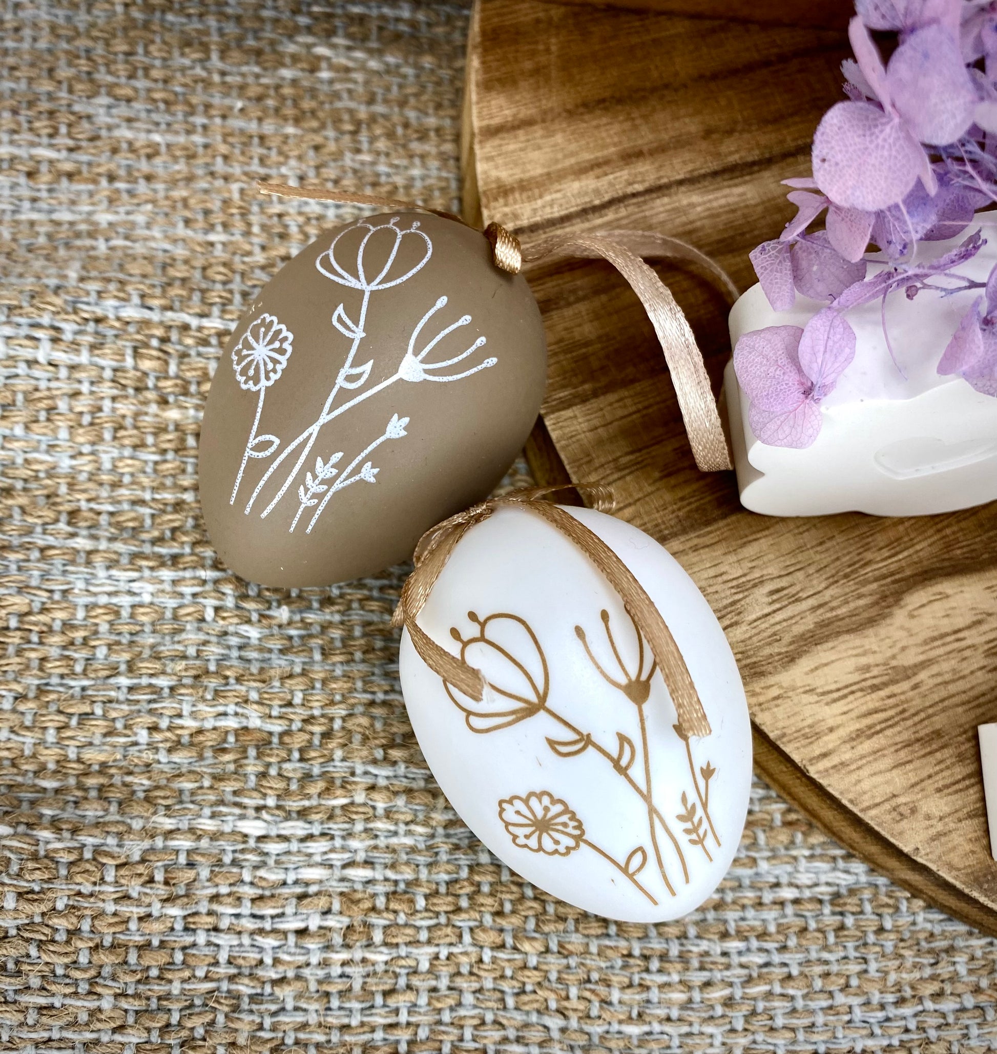 Unsere tollen Kunststoffeier haben alle eine Juteschnur zum Aufhängen und sind in Weiß/Braun mit einem Blumen Druck versehen. Die Eier können auch im Außenbereich verwendet werden. (Farbe könnte durch Feuchtigkeit abgehen) Perfekt um ein modernes, edles und stilvolles Osterfest zu dekorieren und feiern. Sie sind auch super für Tischdekorationen oder zum basteln geeignet!