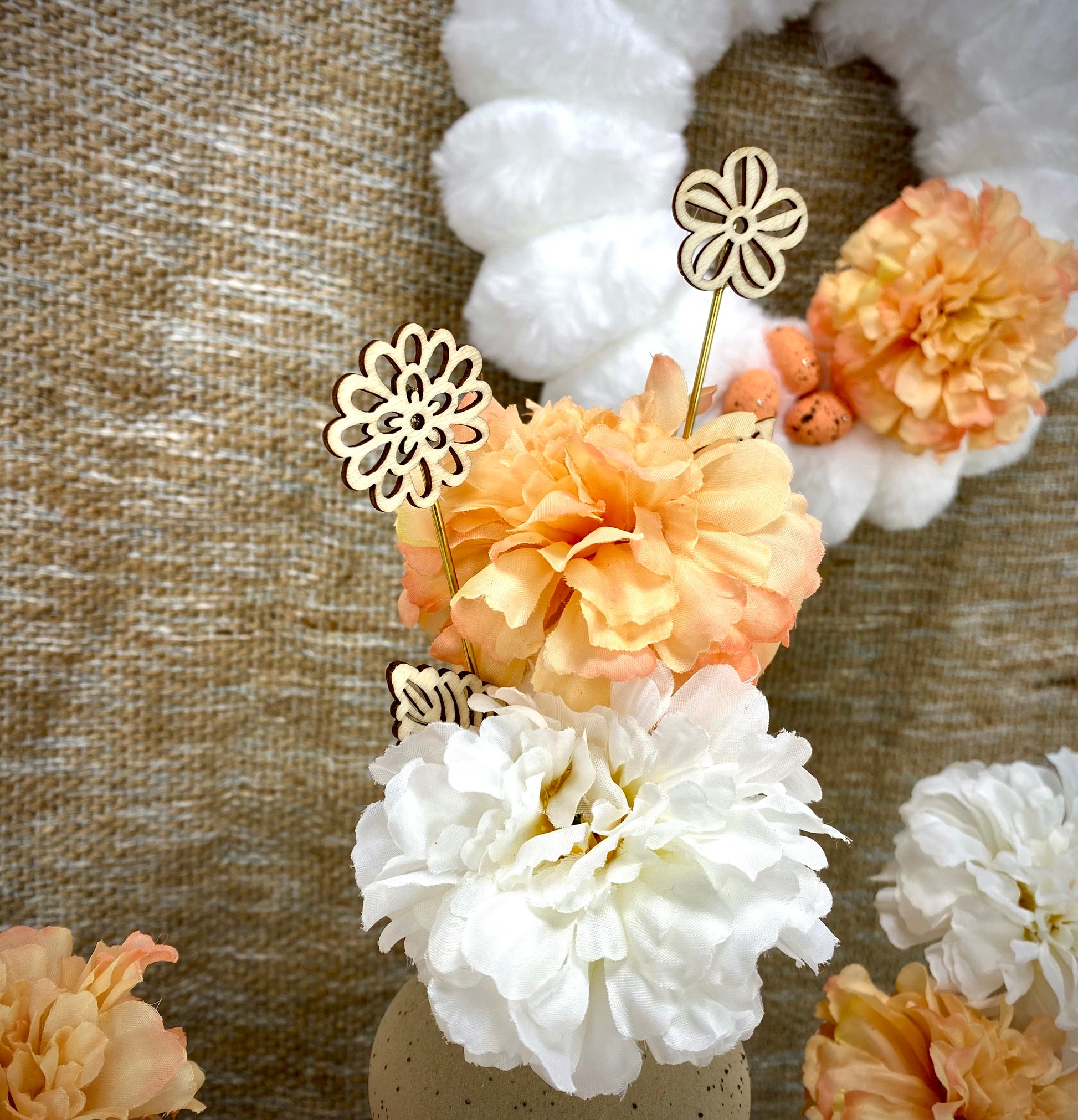 Mit diesen tollen Blumenstecker kannst du jeden Blumenstrauß, Gesteck oder Tischdekoration aufwerten. Du kannst sie auch in deinen Blumentopf stecken. Die Steckblumen sind aus Holz heraus gelasert worden und auf einem dicken goldenen Draht von Hand befestigt.