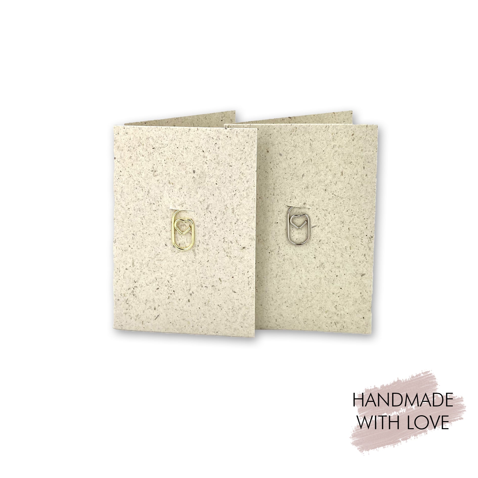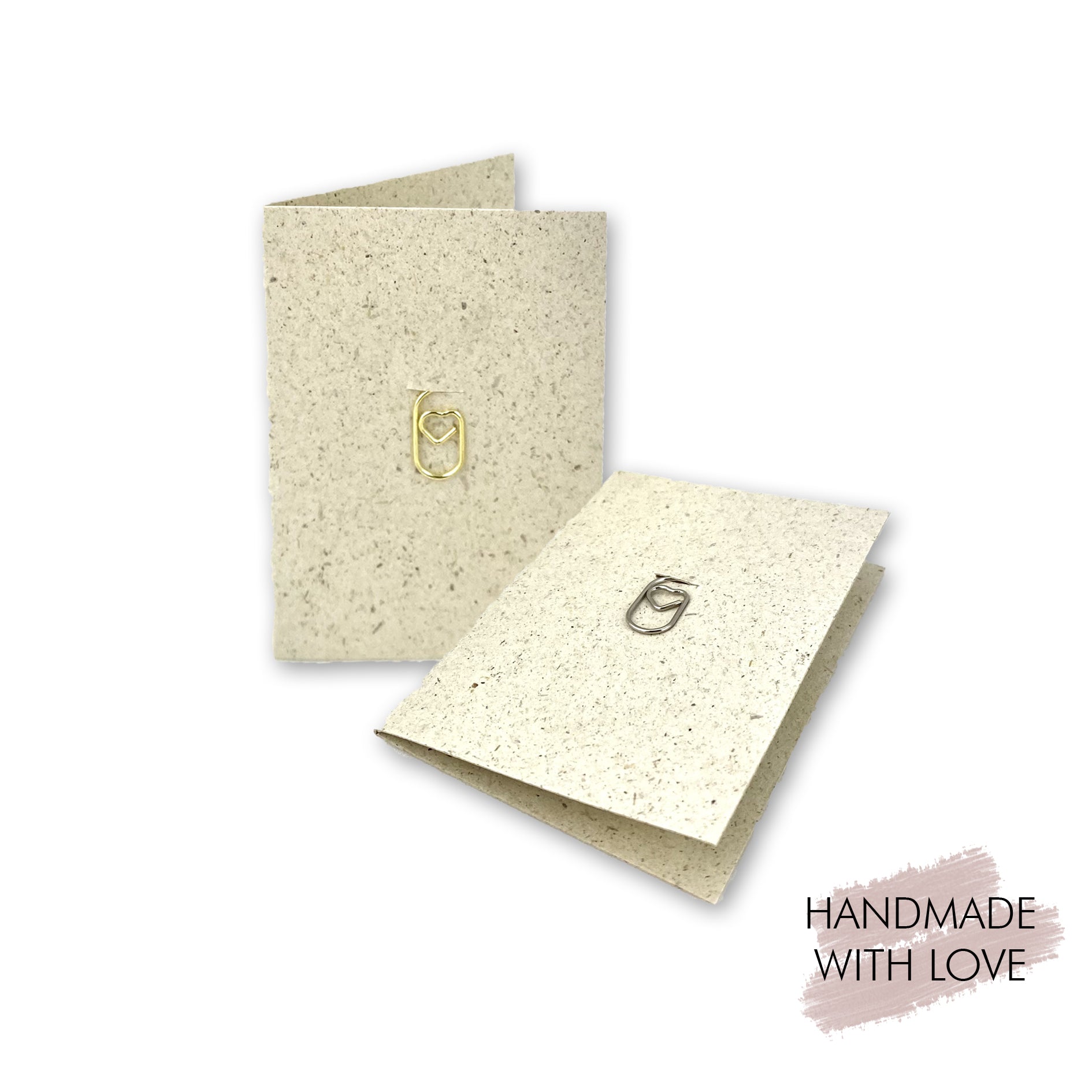 Entdecke unsere handgefertigten Karten! Diese Klappkarten wurden aus Gras hergestellt und haben auf der Vorderseite eine kleine Metallklammer mit einem Herz. Auf der Innenseite, kannst du z.B. auch etwas Geld einklemmen und noch ein lieben Gruß da lassen. Perfekt für kleine Geschenke oder Blumensträuße.