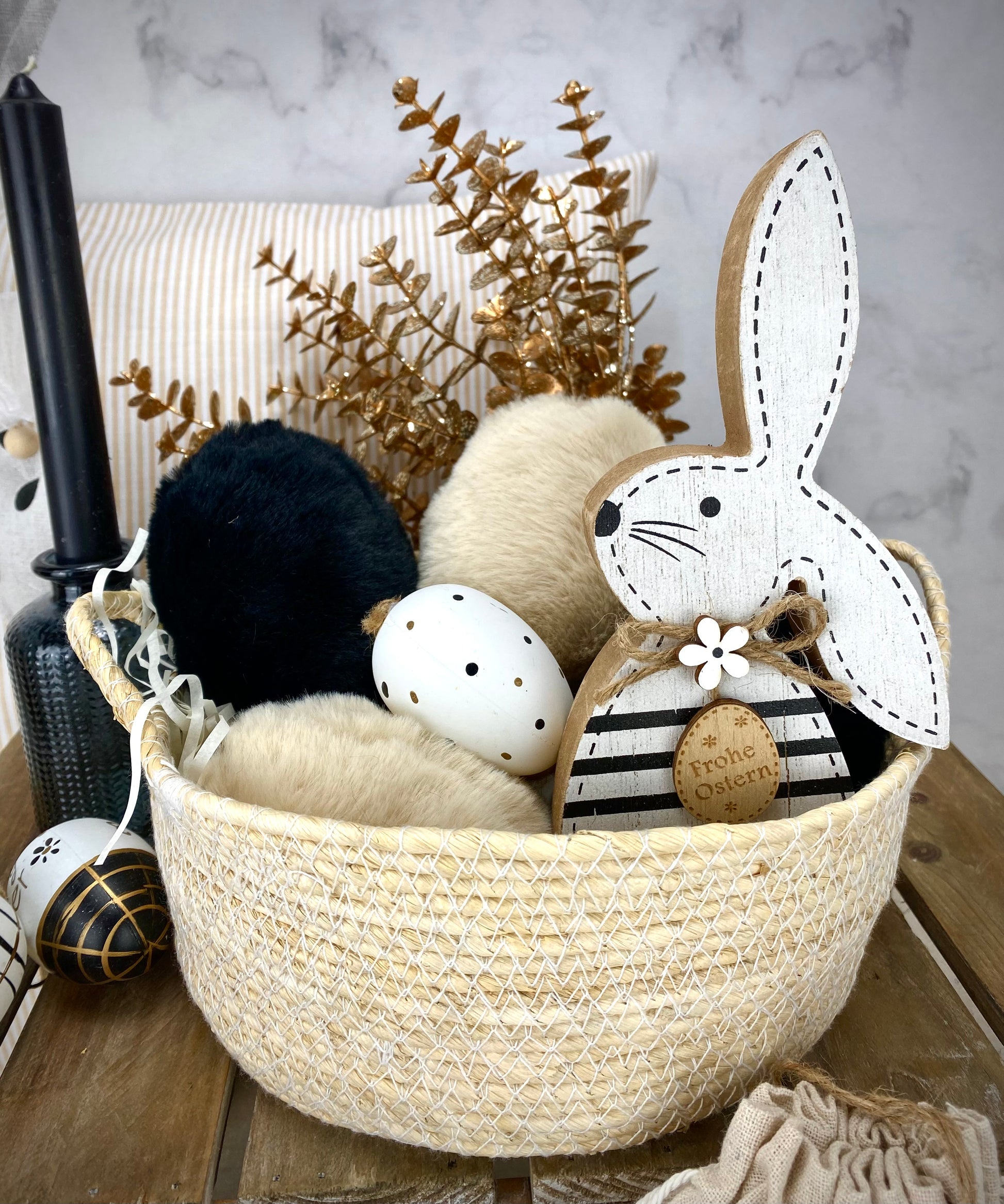 Farbe: Schwarz, Beige Material: Styropor, Kunstfell, Jute Größe: ca. 8cm x 10cm Inhalt: 1 Stück F02230085350